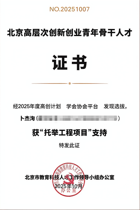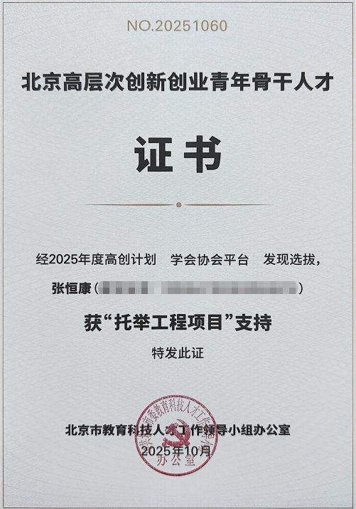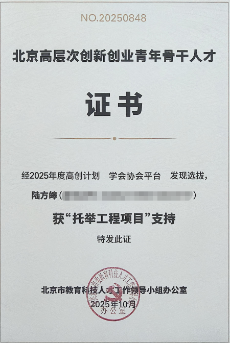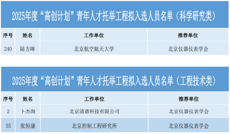 近日,北京市教育科技人才工作领导小组办公室公布了2025年度“高创计划”青年人才托举工程入选人员名单。北京仪器仪表学会推荐的陆方皞(北京航空航天大学)、张恒康(北京控制工程研究所)、卜杰洵(北京清谱科技有限公司)三位优秀青年科技人才成功入选,获得“北京高层次创新创业青年骨干人才”荣誉称号,并将获得为期两年的专项培养与经费支持。